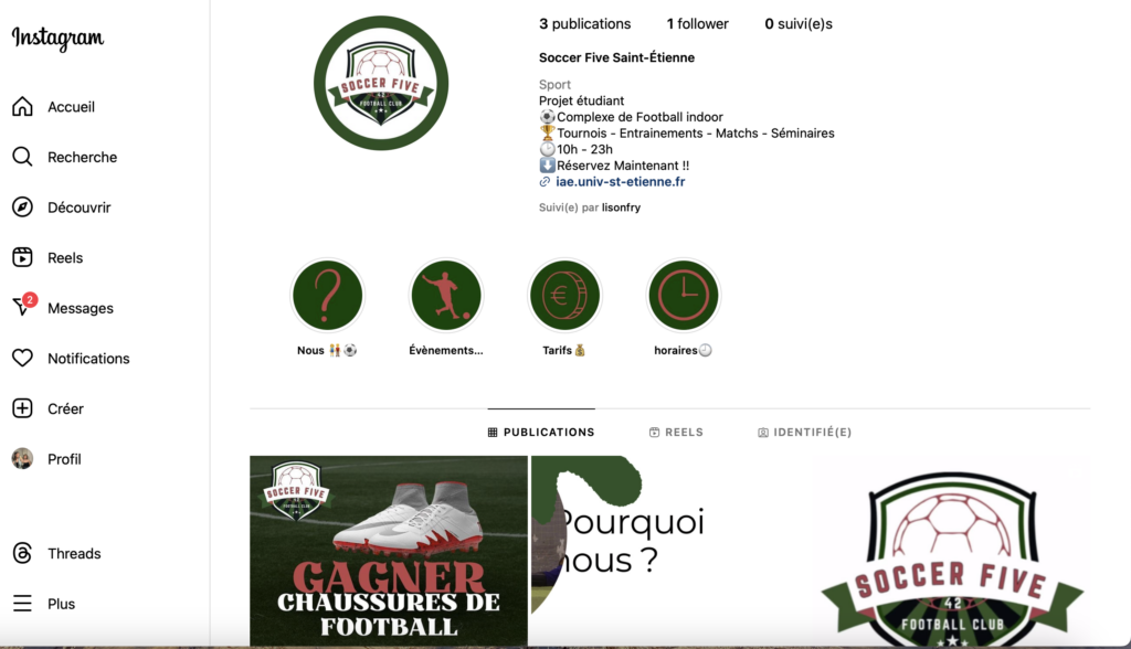Pour le compte d’une entreprise fictive nommée Soccer Five 42 j’ai géré la partie réseaux sociaux en créant un compte Instagram et en l’alimentant par différents posts. Voici un aperçu du travail :